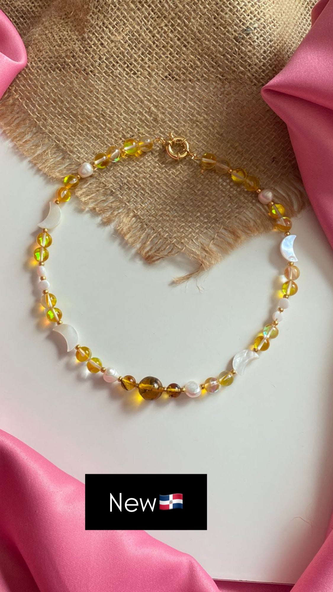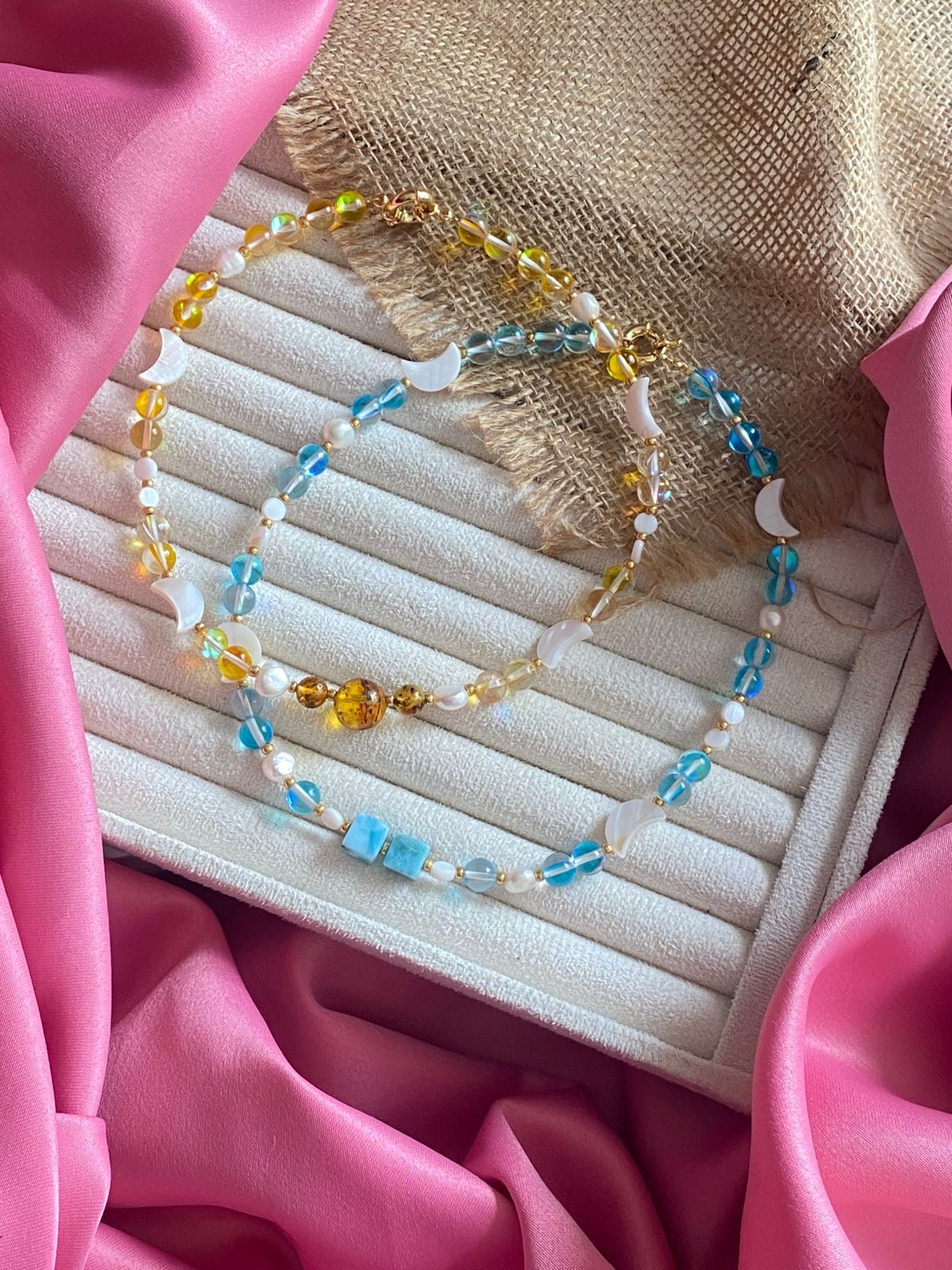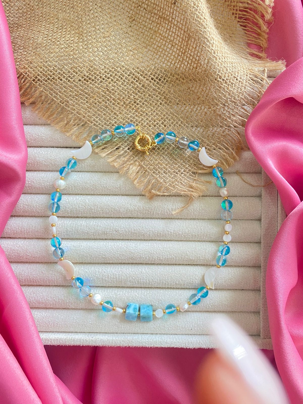 Hermoso collar de nácar , Larimar en cuadros o Nacar y Ámbar en bolas Laminado en Oro 18k con hermoso cierre. Beautiful mother-of-pearl necklace, Larimar in checks or Mother of Pearl and Amber in balls Laminated in 18k Gold with beautiful closure