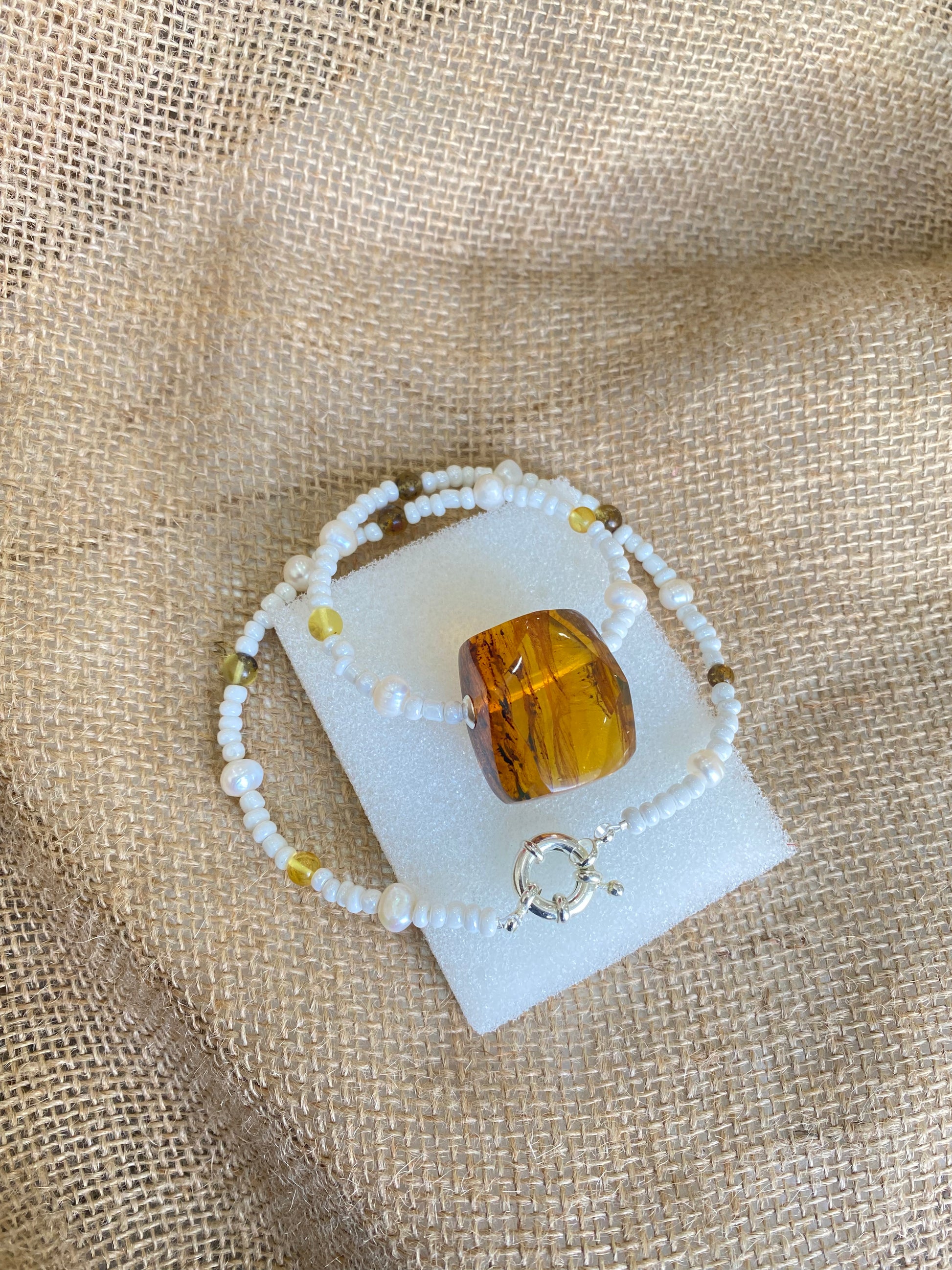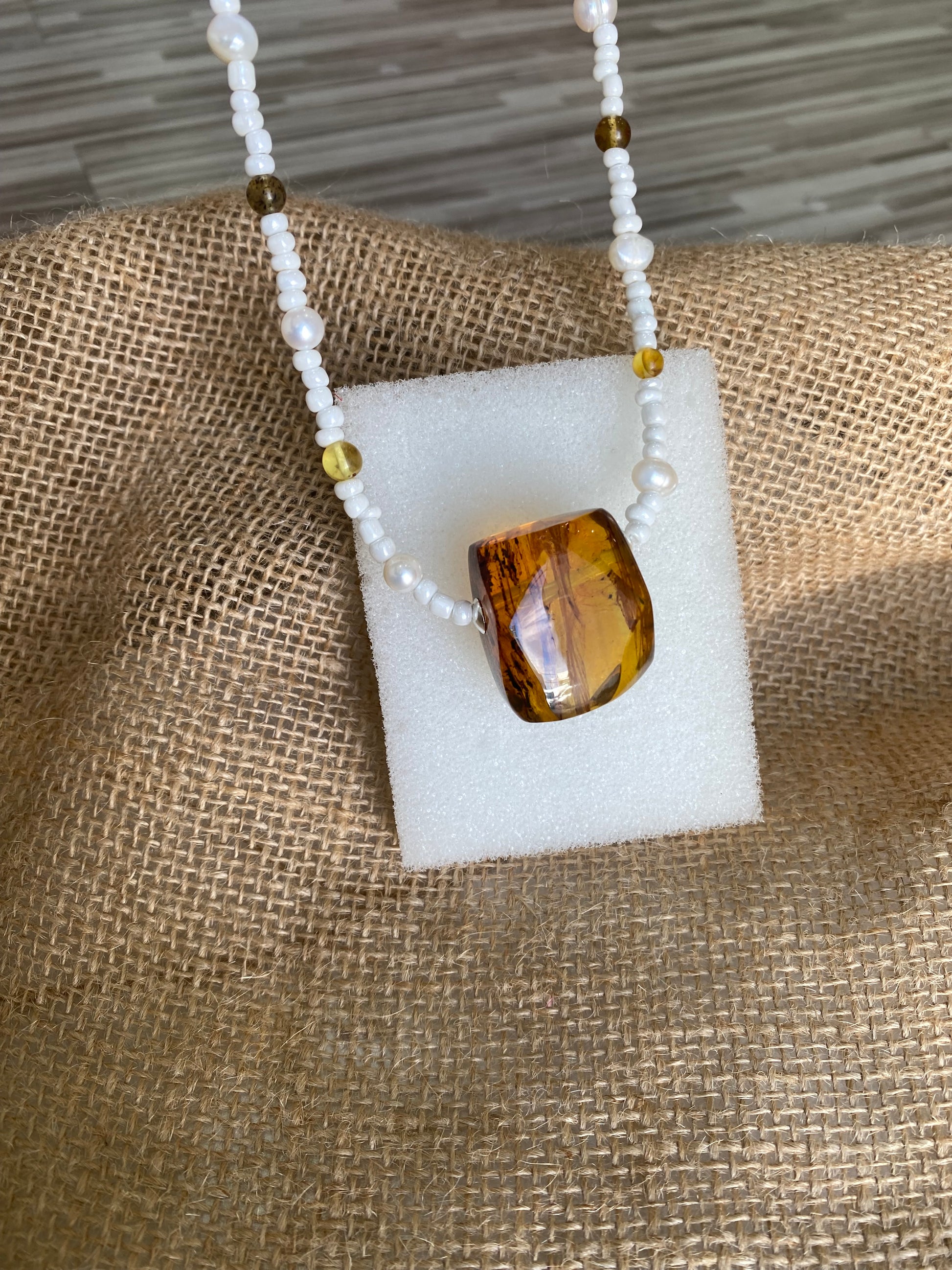Hermoso collar con gran piedra de Ámbar acompañado de bolas de ámbar y Perla! Diseñado por Karla Paniagua Beautiful necklace with large Amber stone accompanied by amber balls and Pearl! Designed by Karla Paniagua